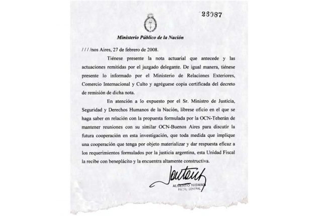 El fiscal había apoyado el memorandum. Años después realizó una denuncia por ello contra la ex presidenta Cristina Kirchner.El documento fue revelado por la Revista Noticias y es de febrero de 2008. Son los documentos que presentó Héctor Timerman y que prueban que el fallecido fiscal siempre supo sobre el Memorándum y, encima, estaba de acuerdo.